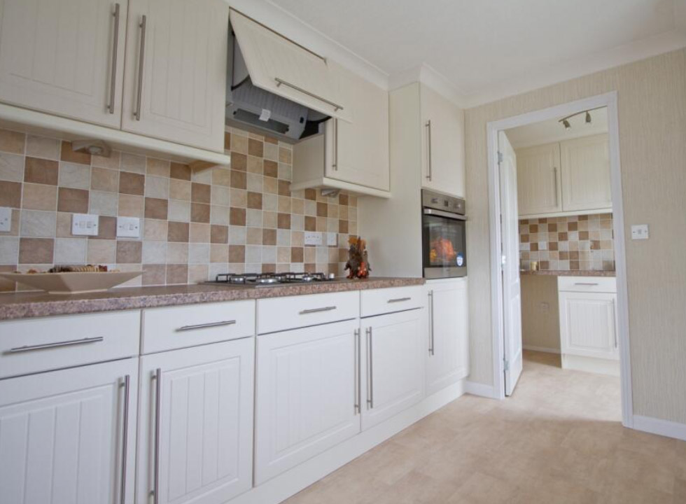 The kitchen takes the practical Tredegar park home design, but adds, tiling from the worktop to the underside of the top lockers, the option of high-gloss doors, integrated fridge/freezer, washing machine and dishwasher. The bedroom furniture has also been upgraded.