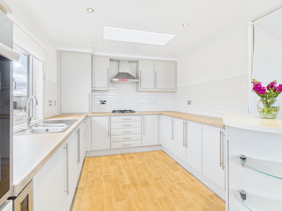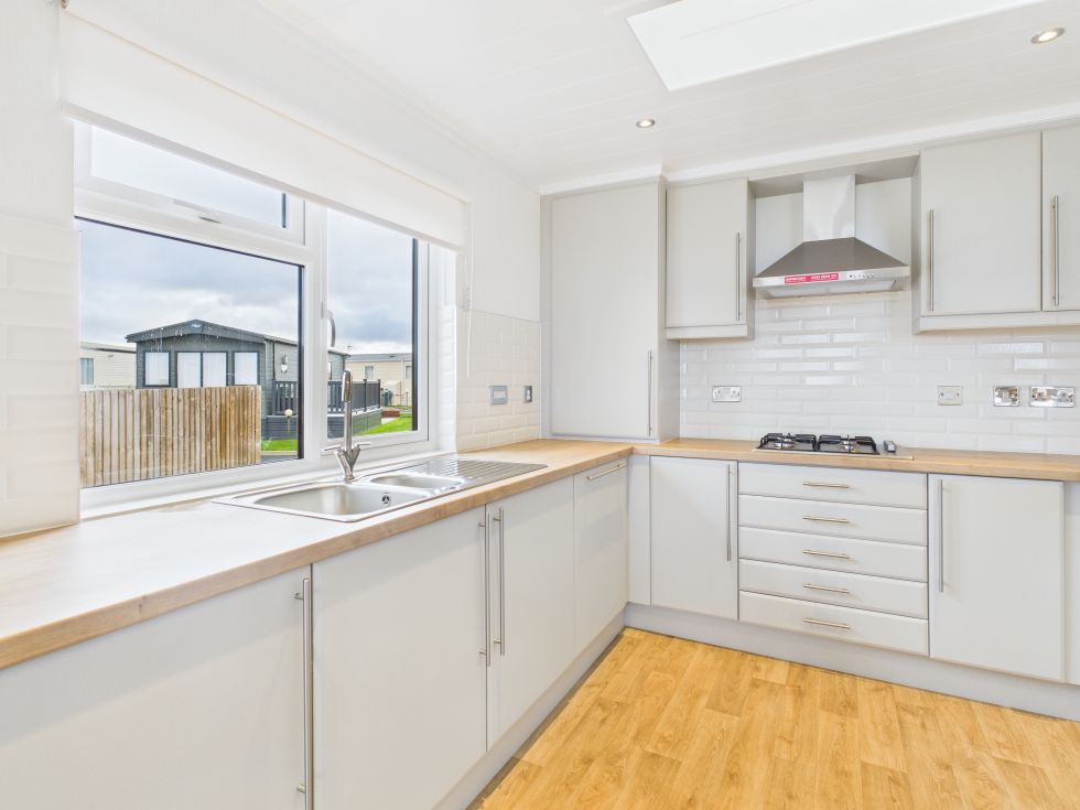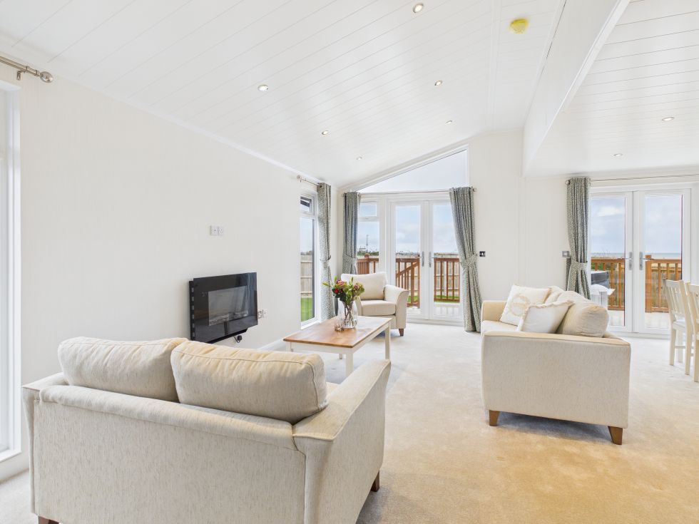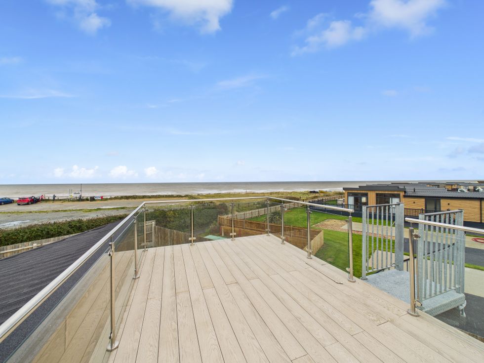 The Stately Albion Warwick Executive at Sandy Beach Holiday Park, Bacton, Norfolk offers an elevated lodge experience with premium features throughout. Perfectly positioned right on the beach with stunning sea views, this spacious lodge is designed for both comfort and style. The thoughtfully planned kitchen features a Velux window for abundant natural light, upgraded cabinets with elegant glass feature shelves, and an integrated wine cooler. The open-plan living area showcases a fully vaulted ceiling with a dramatic glass front elevation, creating a light-filled and airy environment. Externally, a beautifully crafted gable adds to the lodge’s charm and overall “wow” factor.