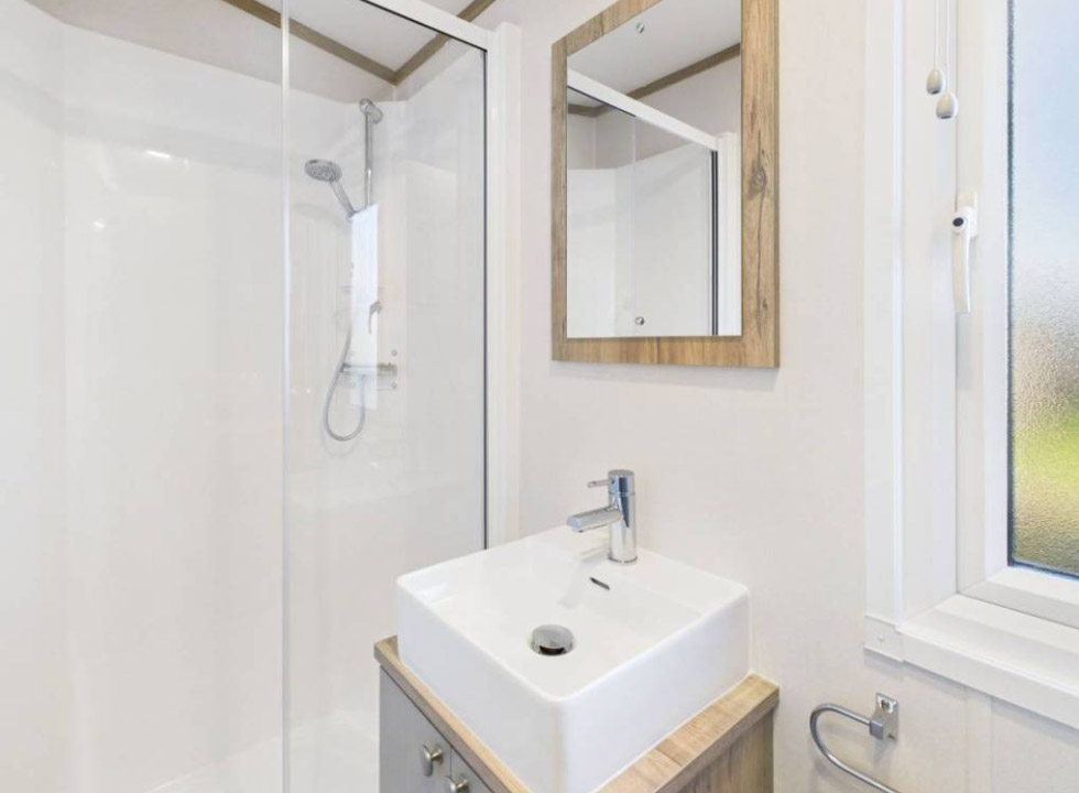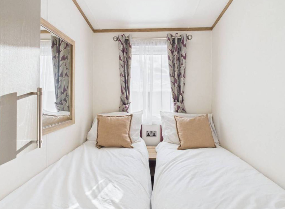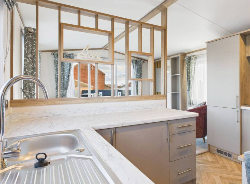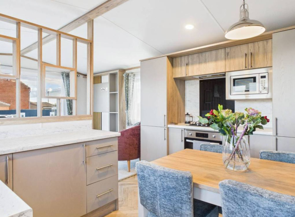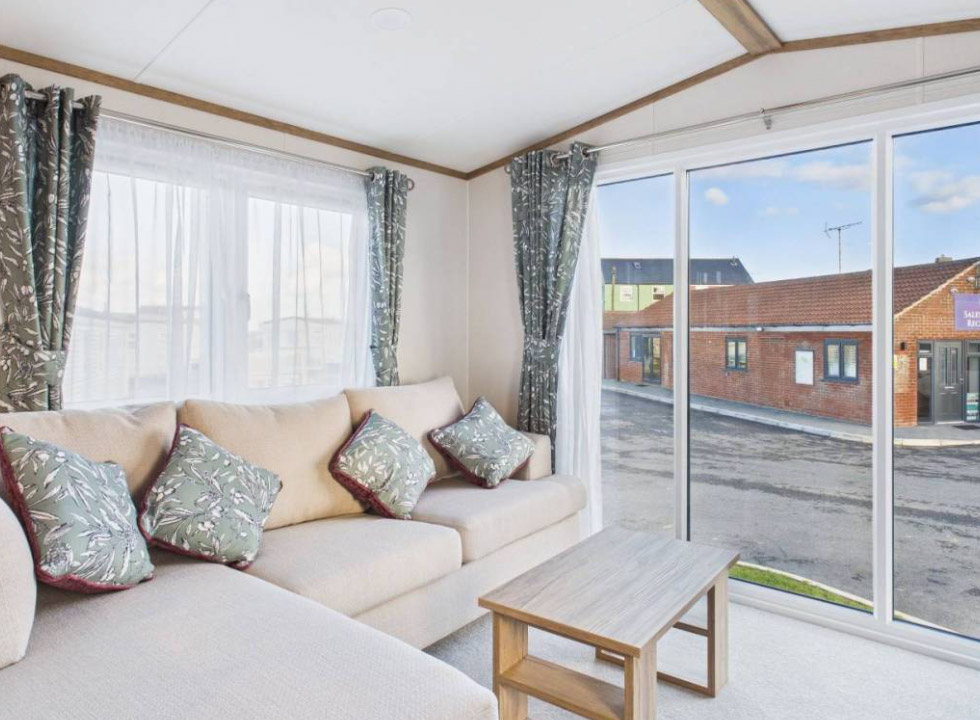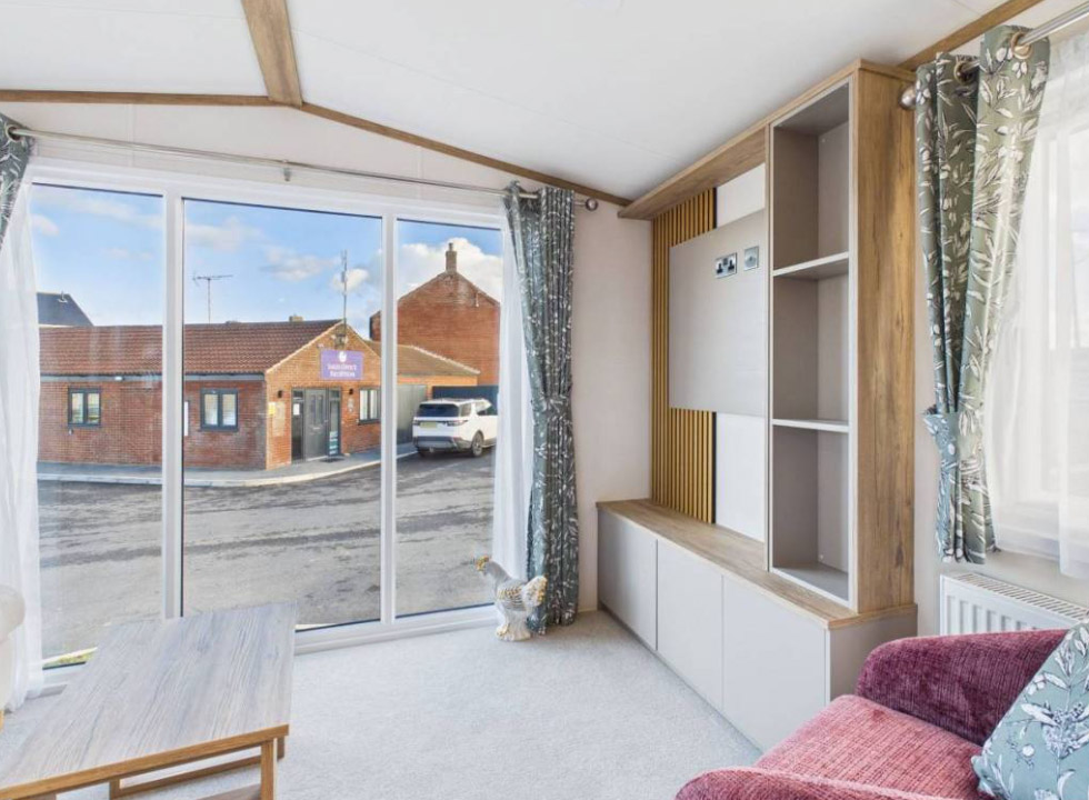 Discover the ultimate coastal retreat with the beautiful Regal Hemsworth at Sandy Beach Holiday Park in Bacton, Norfolk. This spacious two-bedroom holiday home is designed with both comfort and style in mind, offering everything you need to relax and unwind by the sea. Step inside and you’re greeted by a bright, open-plan living area that perfectly blends modern design with a cosy, home-from-home feel. The large L-shaped sofa creates a comfortable space to unwind, while the stylish room divider and contemporary TV and storage unit add a touch of elegance. Patio sliding doors allow natural light to flood the room, creating an airy and inviting atmosphere — ideal for coastal living.