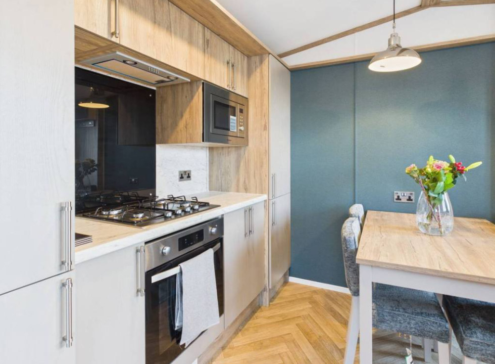 The kitchen and dining area has been thoughtfully designed for both practicality and charm, featuring oak-effect finishes, a freestanding dining table and chairs, and a fully equipped kitchen with a four-burner gas hob, electric oven, integrated fridge freezer, and microwave. Whether you’re cooking for family or entertaining friends, this space makes dining in a pleasure.