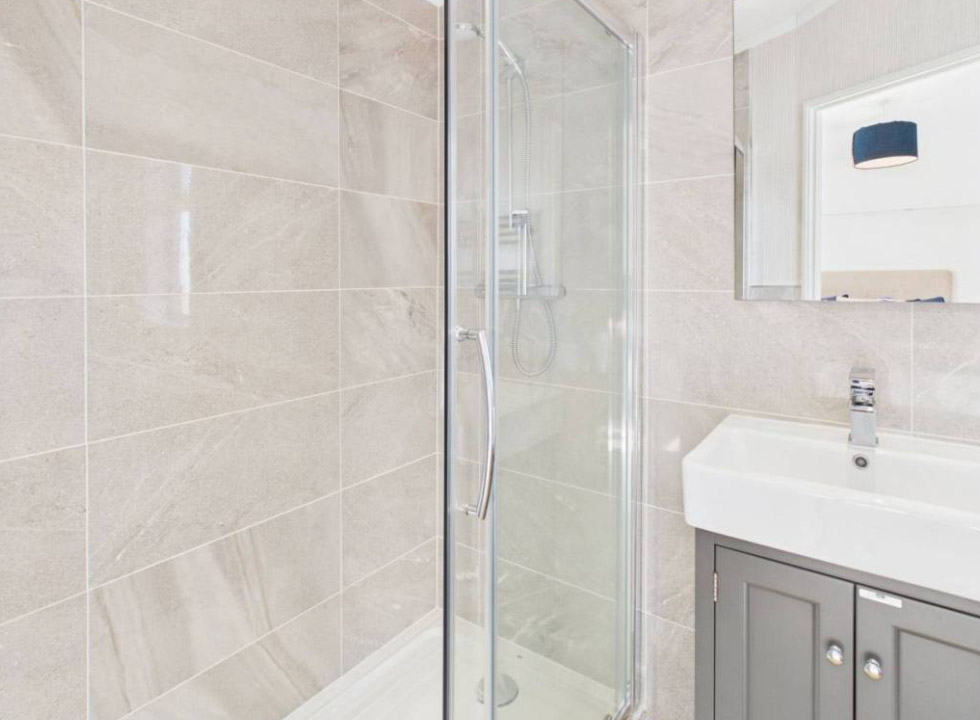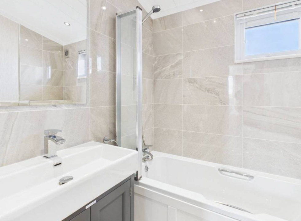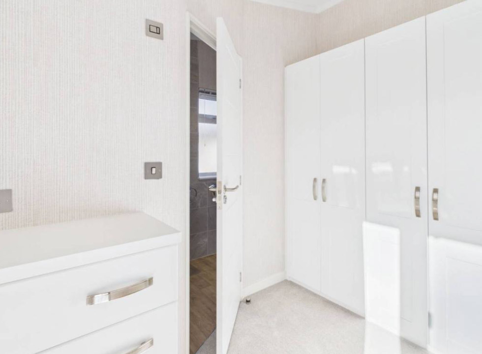 The stylish lounge and dining area includes comfortable sofas, a modern entertainment unit and dining set, while the fully equipped kitchen features integrated appliances, a five-burner hob, and a practical island breakfast bar. Both bedrooms are beautifully finished with fitted wardrobes, feature lighting and coordinated fabrics. The master bedroom has a full-height mirror and en-suite with a large shower, while the main bathroom offers a shower-over-bath and contemporary fittings.
