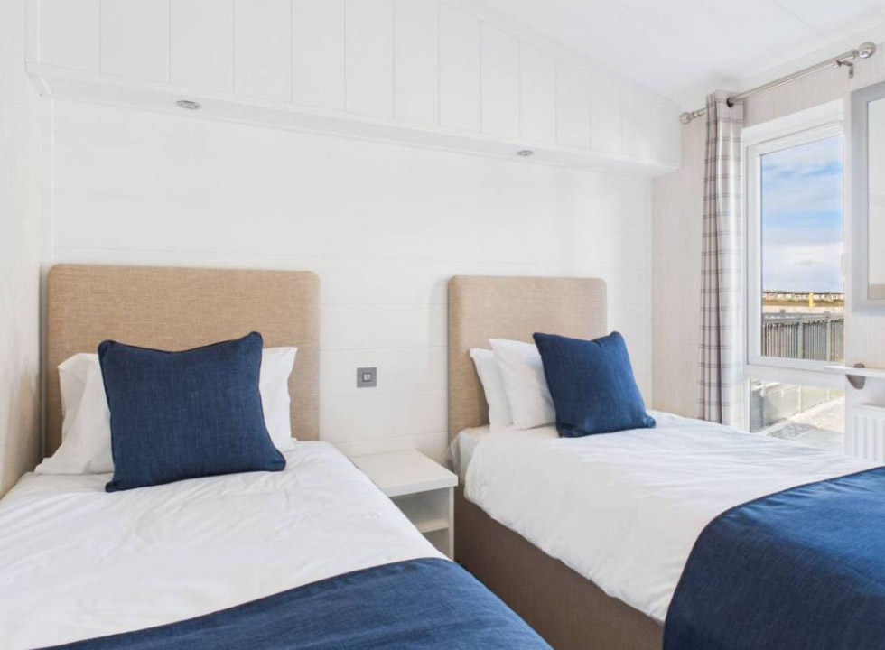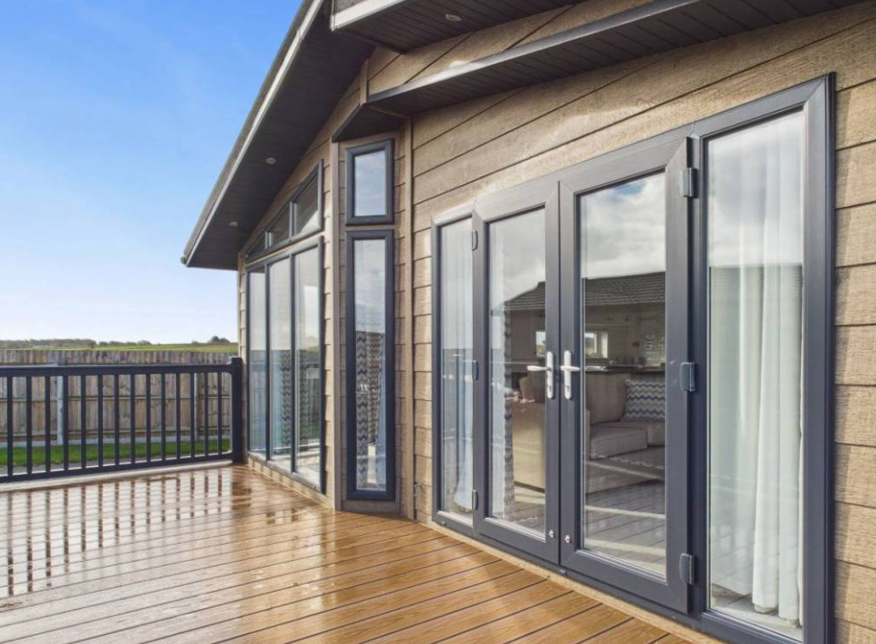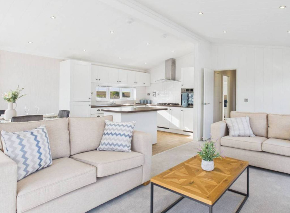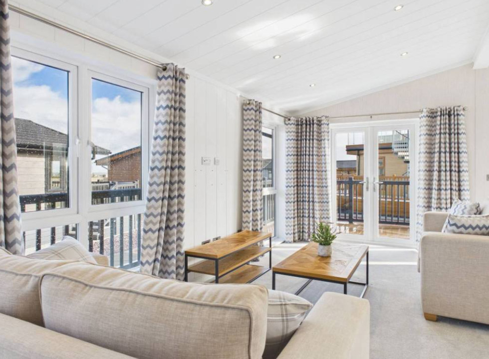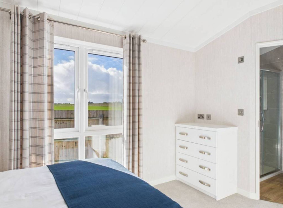 The Alderney Luxury Lodge at Sandy Beach Holiday Park in Bacton combines modern coastal design with year-round comfort. Set right on the beach in a peaceful location, this beautifully crafted lodge is built to BS 3632 residential standards and protected by a 10-year GoldShield warranty. Its striking split roofline, feature glazing and cladding give it real presence, while large picture windows and French doors fill the open-plan living space with natural light. Inside, vaulted white-panelled ceilings, soft neutral tones and touches of dusky blue create a calm, timeless feel.