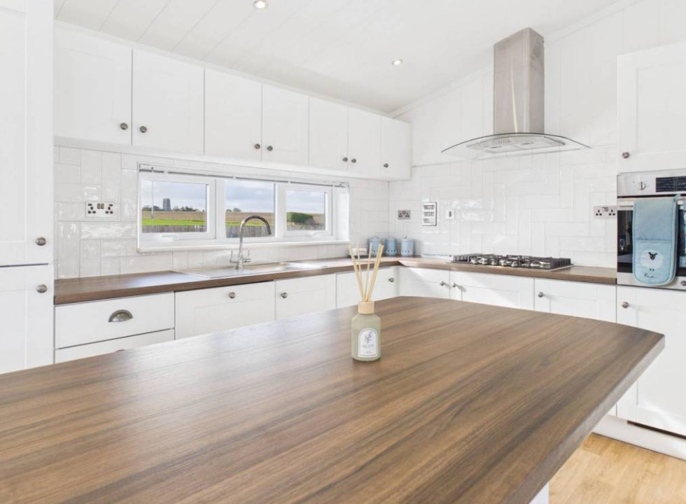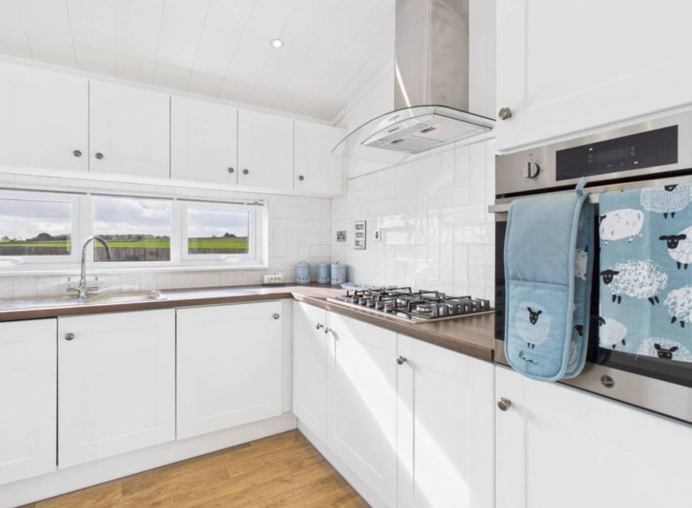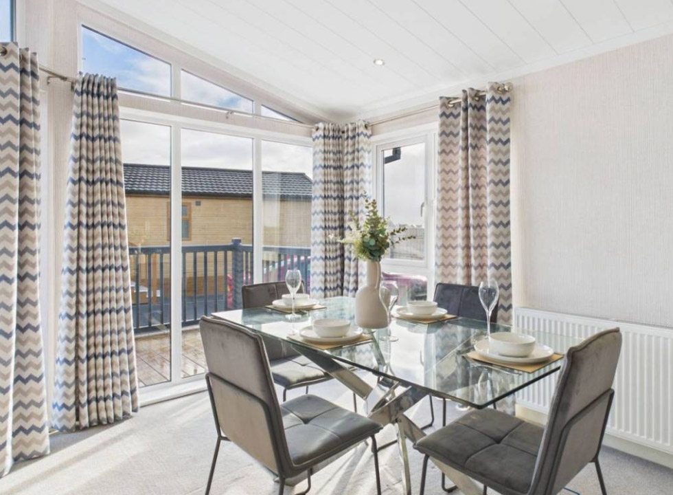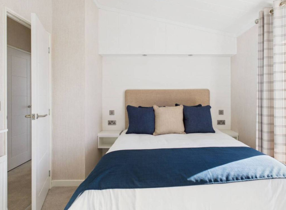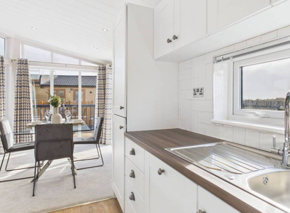 The Alderney Luxury Lodge at Sandy Beach Holiday Park in Bacton combines modern coastal design with year-round comfort. Set right on the beach in a peaceful location, this beautifully crafted lodge is built to BS 3632 residential standards and protected by a 10-year GoldShield warranty. Its striking split roofline, feature glazing and cladding give it real presence, while large picture windows and French doors fill the open-plan living space with natural light. Inside, vaulted white-panelled ceilings, soft neutral tones and touches of dusky blue create a calm, timeless feel.