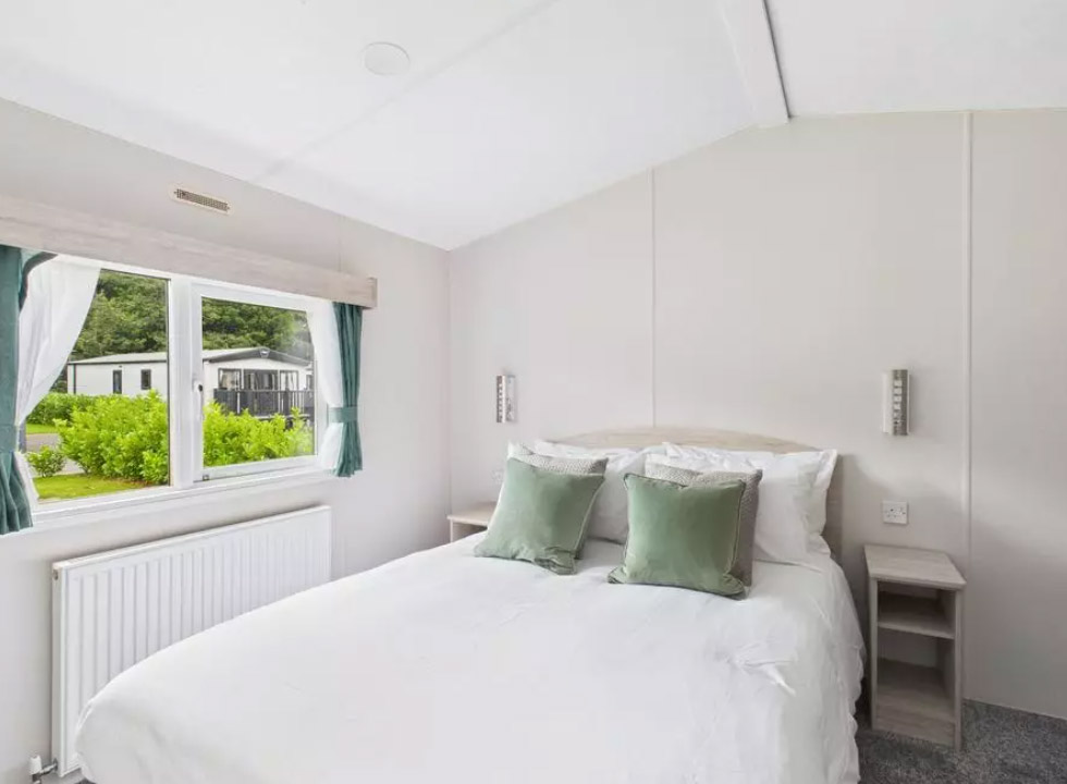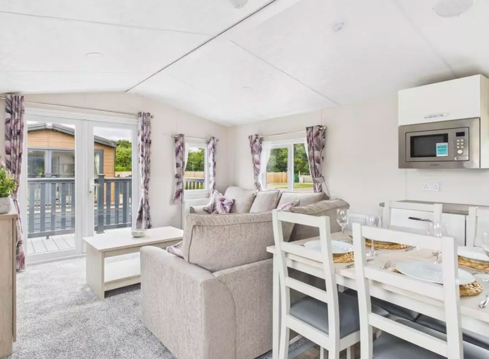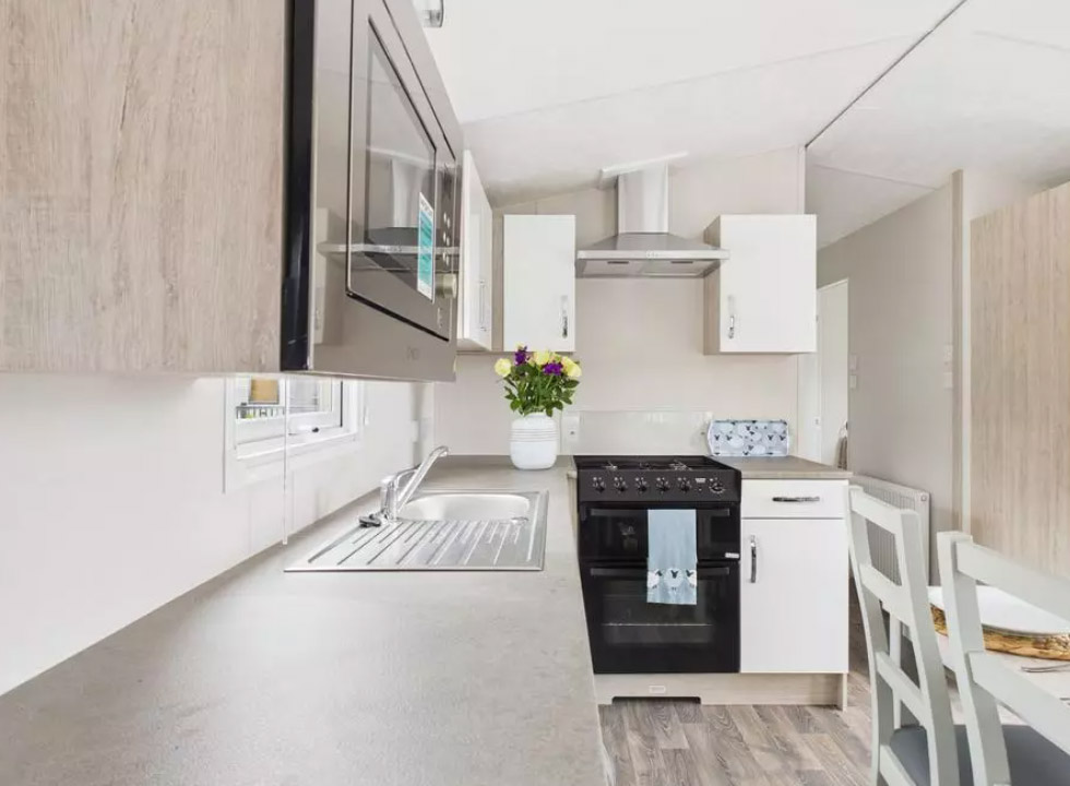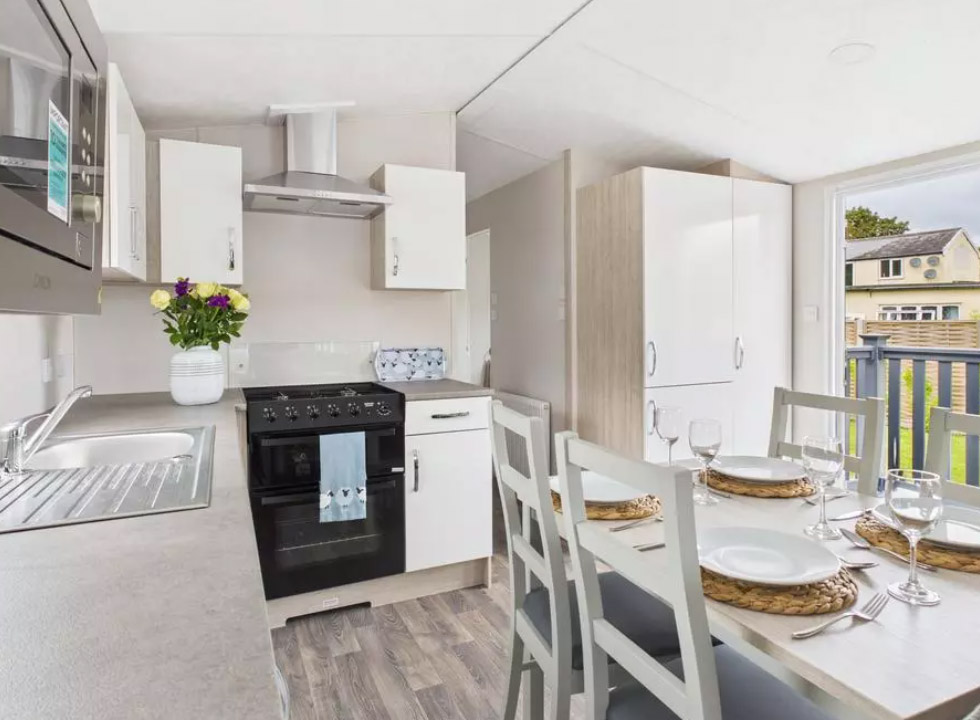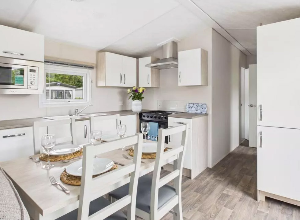 The kitchen and dining area has been thoughtfully designed for both practicality and charm, featuring oak-effect finishes, a freestanding dining table and chairs, and a fully equipped kitchen with a four-burner gas hob, electric oven, integrated fridge freezer, and microwave. Whether you’re cooking for family or entertaining friends, this space makes dining in a pleasure.