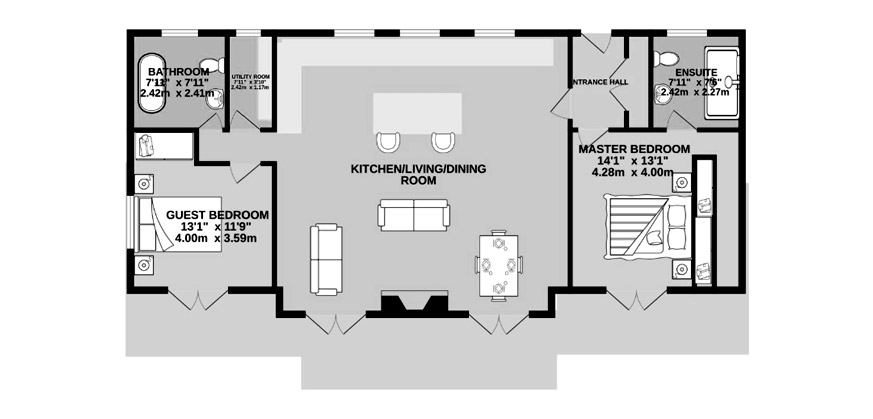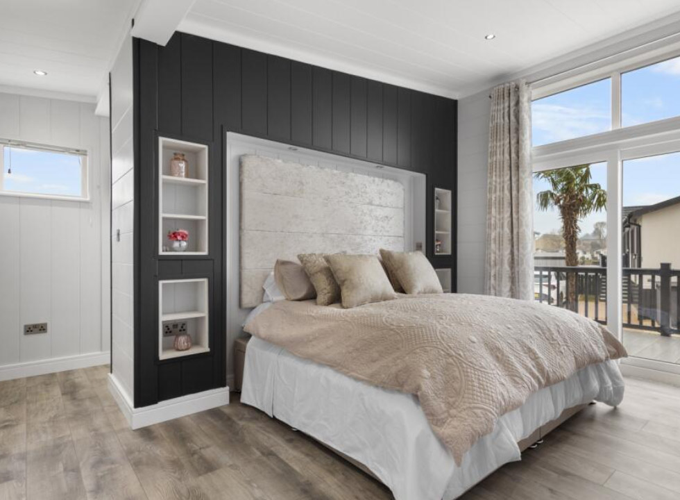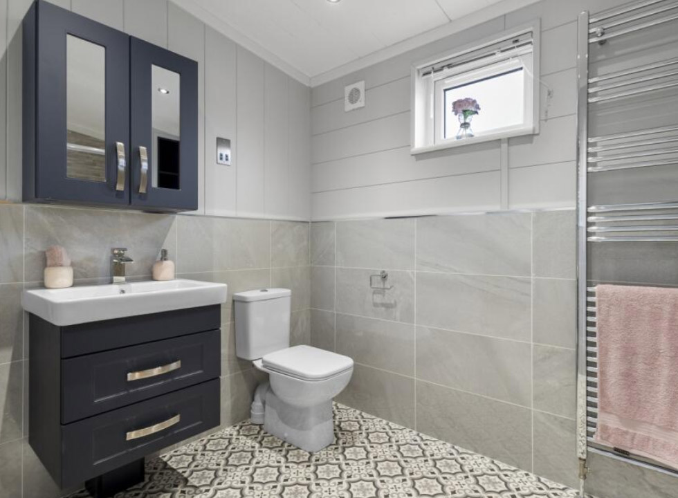 The home boasts two spacious double bedrooms. The guest bedroom is conveniently located next to a beautifully appointed bathroom that features a bath with shower over, while the master bedroom has been designed with pure comfort in mind, featuring an en-suite shower room and a walk-in wardrobe area. Both bedrooms offer direct access to the south-west-facing deck via French doors, allowing you to step outside and soak up the atmosphere.